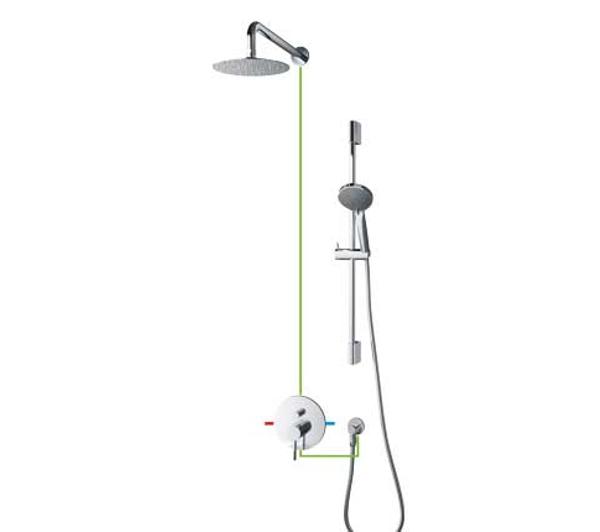 : deszczownica, słuchawka prysznicowa, wąż prysznicowy, drążek prysznicowy, bateria, ramię natrysku