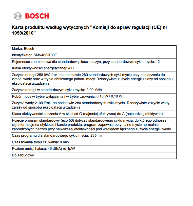 Zastosowane technologie: system koszy Bosch/Siemens VarioFlex, optymalne zużycie wody Bosch ActiveWater, skrócenie cyklu Bosch/Siemens VarioSpeed Plus, sensor załadunku Bosch/Siemens, naprzemienne mycie Bosch/Siemens, łatwe zamykanie i otwieranie Bosch/Siemens EasyLock
