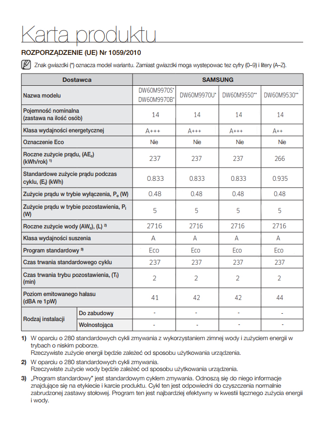Wyposażenie dodatkowe: instrukcja obsługi w języku polskim, karta gwarancyjna, półka na filiżanki, szuflada na sztućce, wąż dopływowy z zabezpieczeniem przed zalaniem, wąż odpływowy